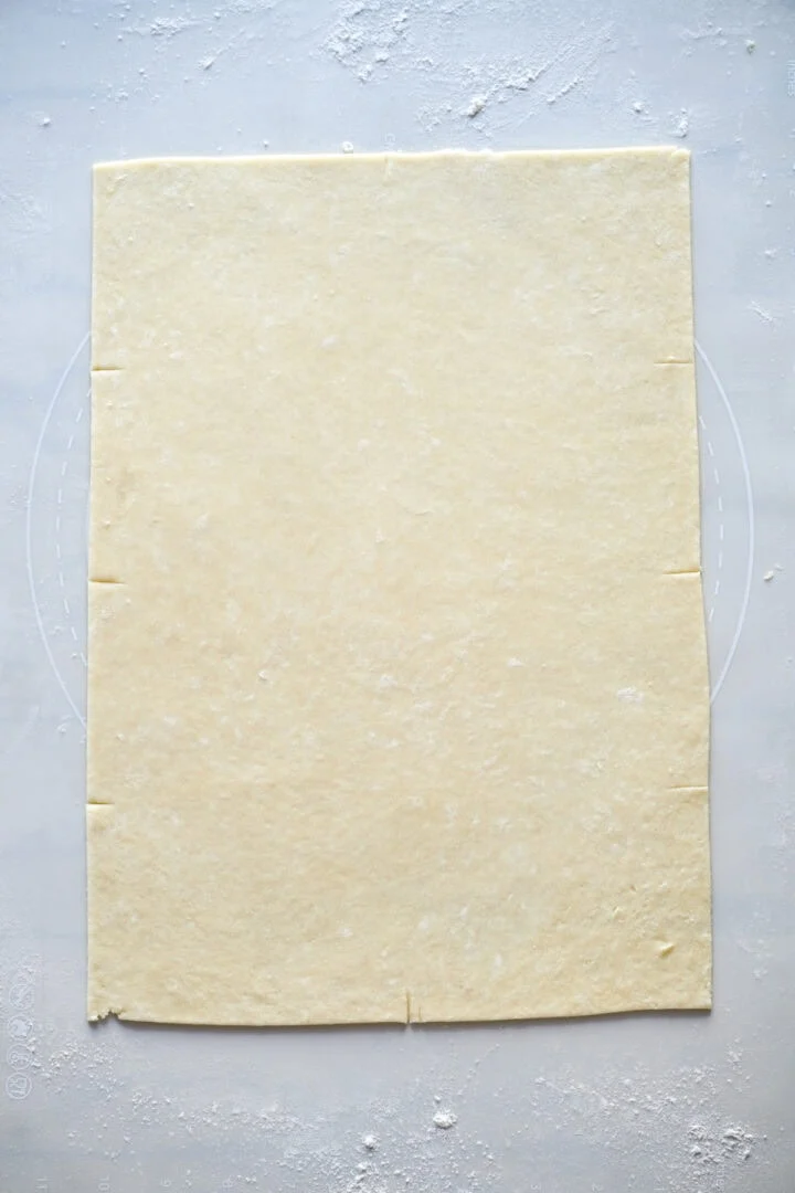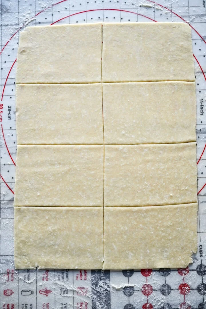 - På en väl mjölad yta rullar du halvan av degen till en stor rektangel som är ungefär ⅛ tum tjock och klipper sedan till en rektangel med rak kanter som är 14×10 tum. Skär rektangeln på mitten på längden, skär sedan varje halva i 4 rektanglar för totalt 8 rektanglar.